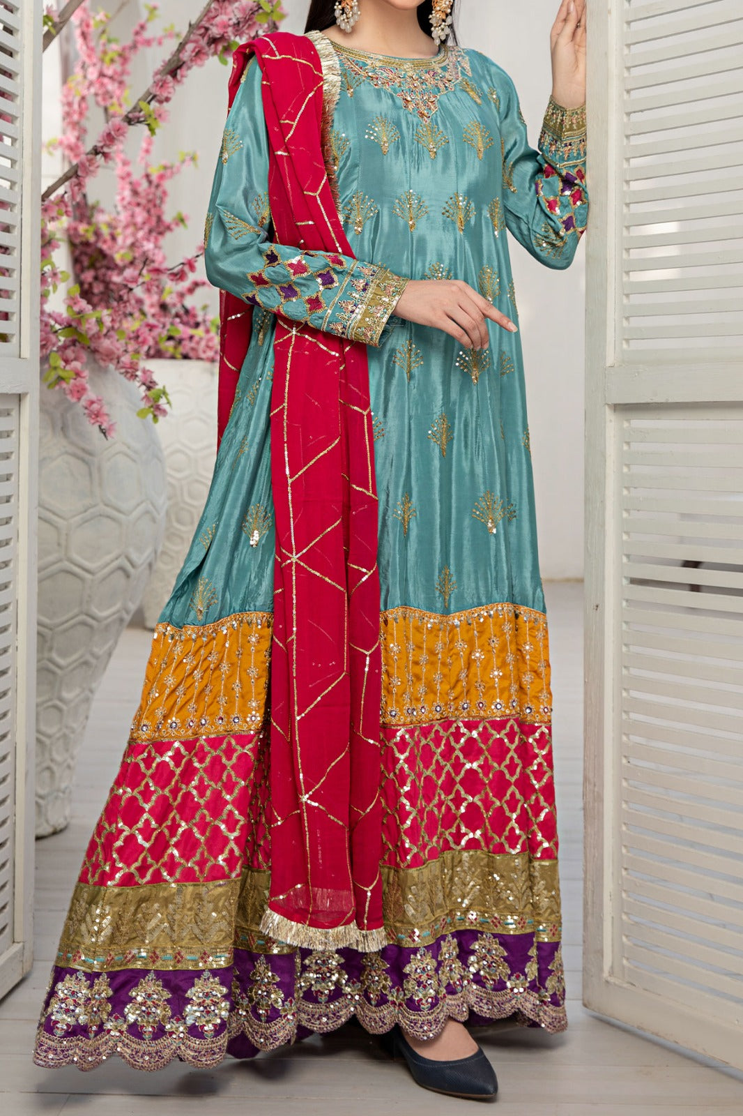Introducing our Blue Embroidered Maxi with Multicoloured Border. The grip material provides a comfortable fit, while the intricate embroidery and sequin embellishments add cultural richness. Paired with a grip sharara and chiffon dupatta with geometrical embroidery, this ensemble is perfect for any occasion.