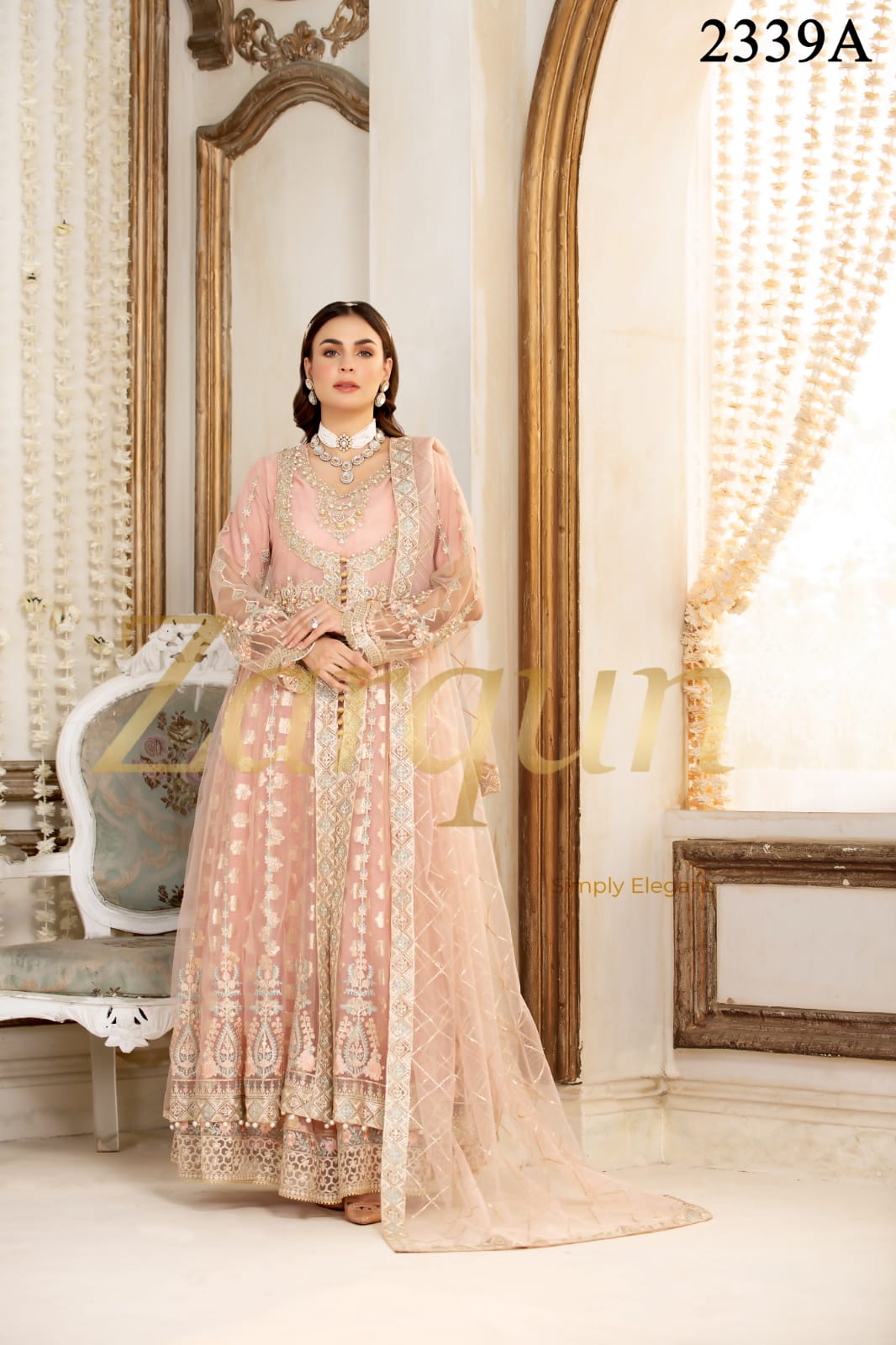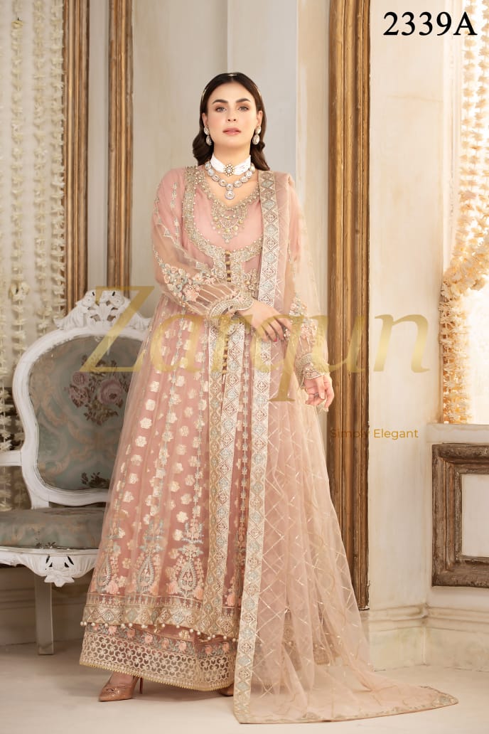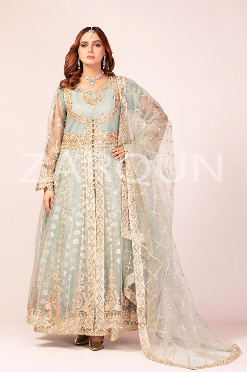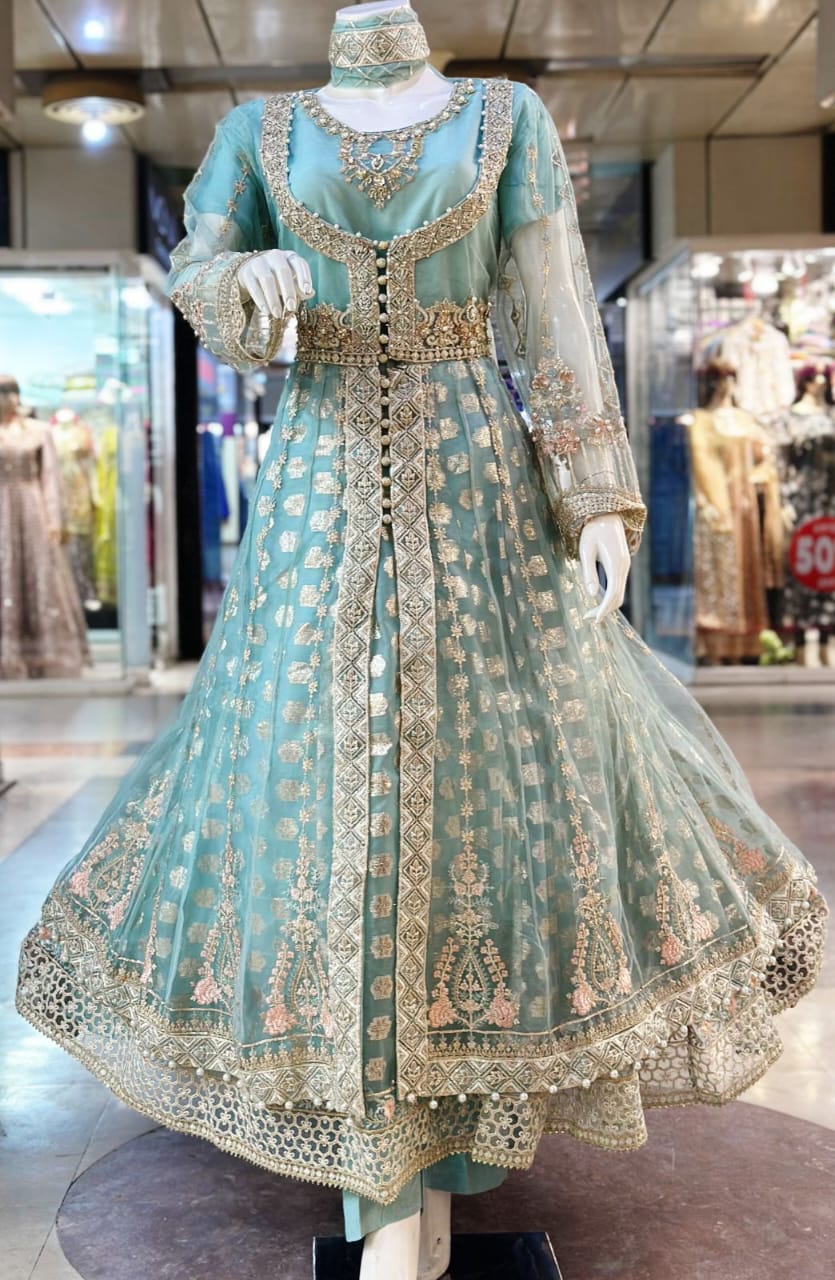 Upgrade your formal function or wedding attire with our Embroidered Organza Double Maxi. Featuring intricate embroidery and heavy embellishments, this double maxi comes with a matching trouser and dupatta, making it the perfect statement piece for any special occasion. With its all-over jaal embroidery and embellished border, you'll be sure to turn heads and feel elegant and sophisticated. Elevate your style game with our stunning ensemble.