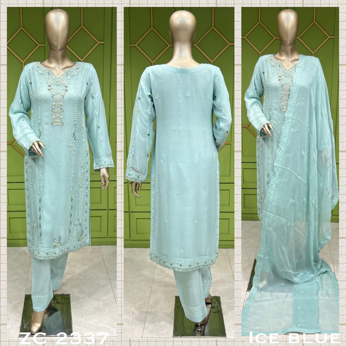 Experience effortless elegance with our Ice Blue Embellished and Embroidered Shirt. Adorned with delicate embellishments on the neckline and hem, this shirt exudes luxurious charm. Paired with a simple yet graceful dupatta and straight trouser, it is the perfect choice for any party or traditional occasion. Elevate your style game with this stunning ensemble.