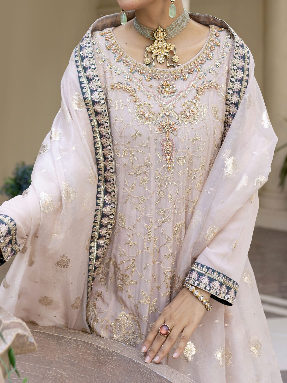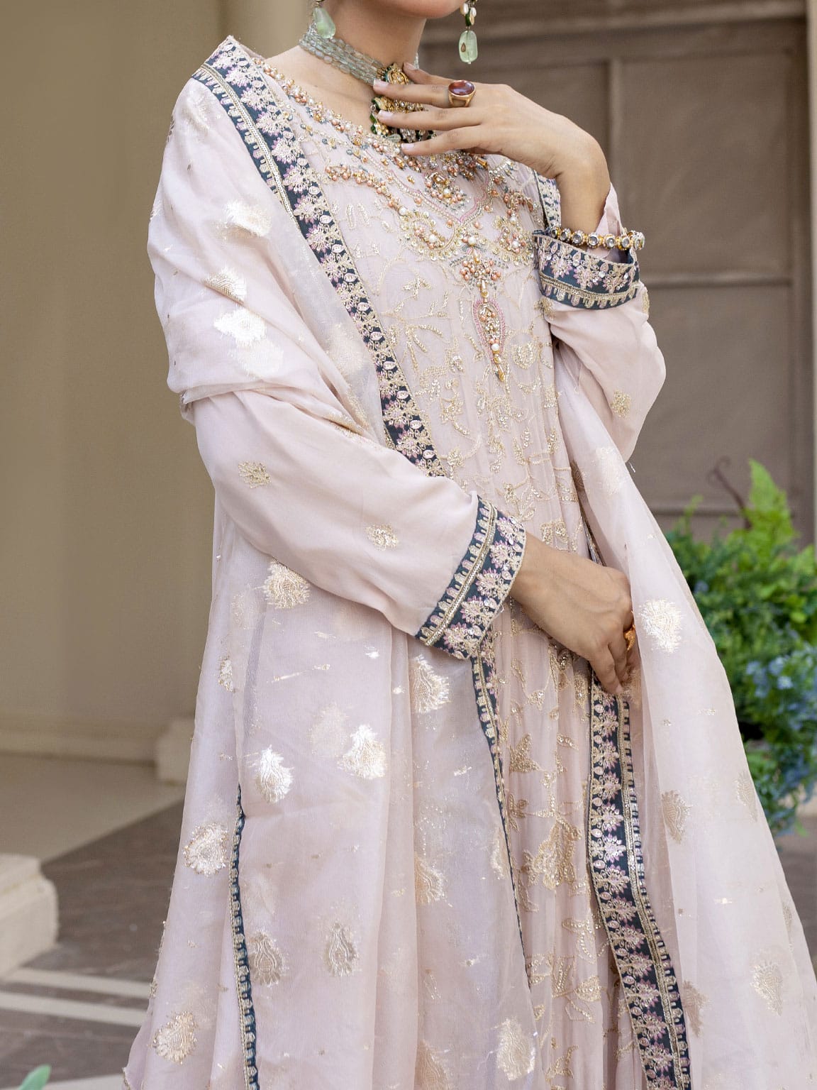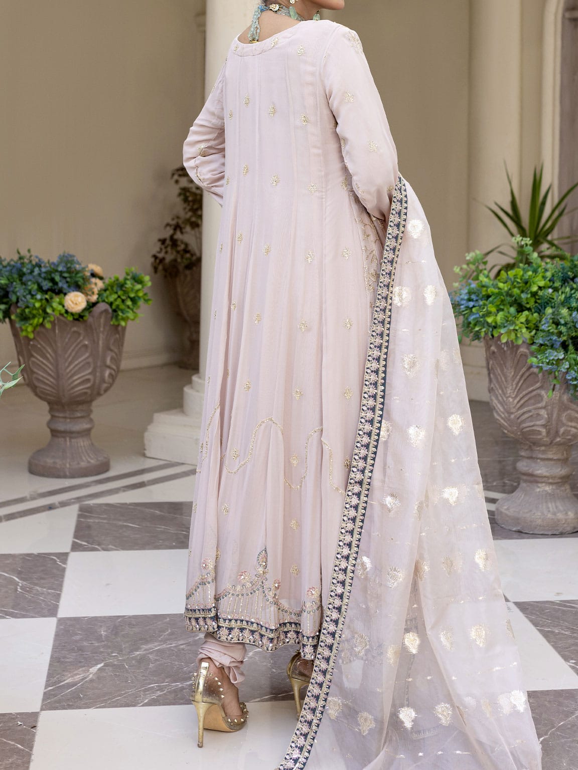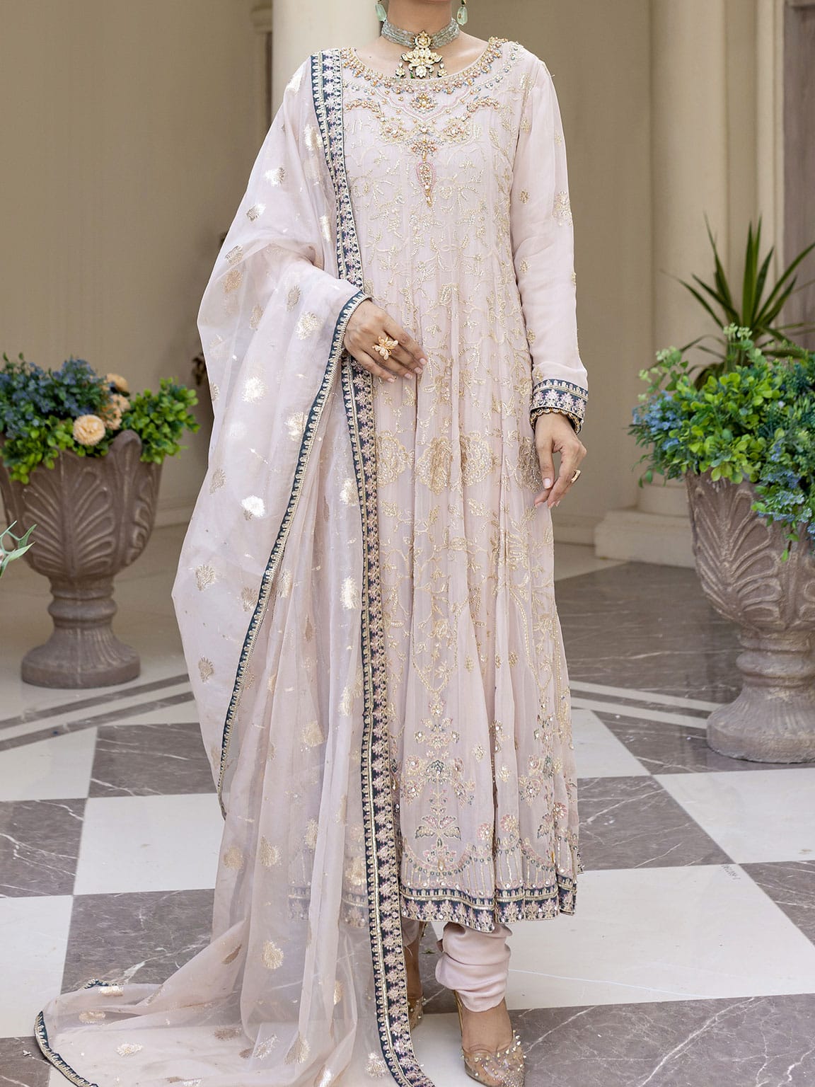 Light Pink embroidered and embellished Chiffon long frock with Viscose Churidaar pairs with embroidered organza dupatta with embellished border