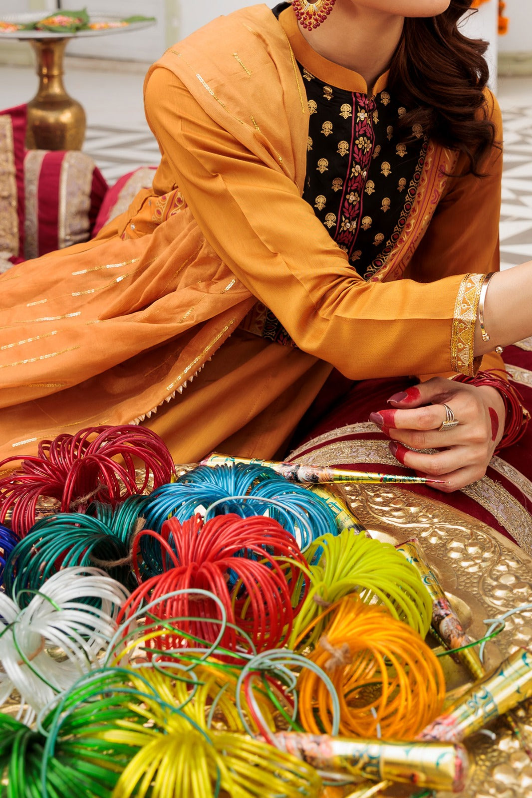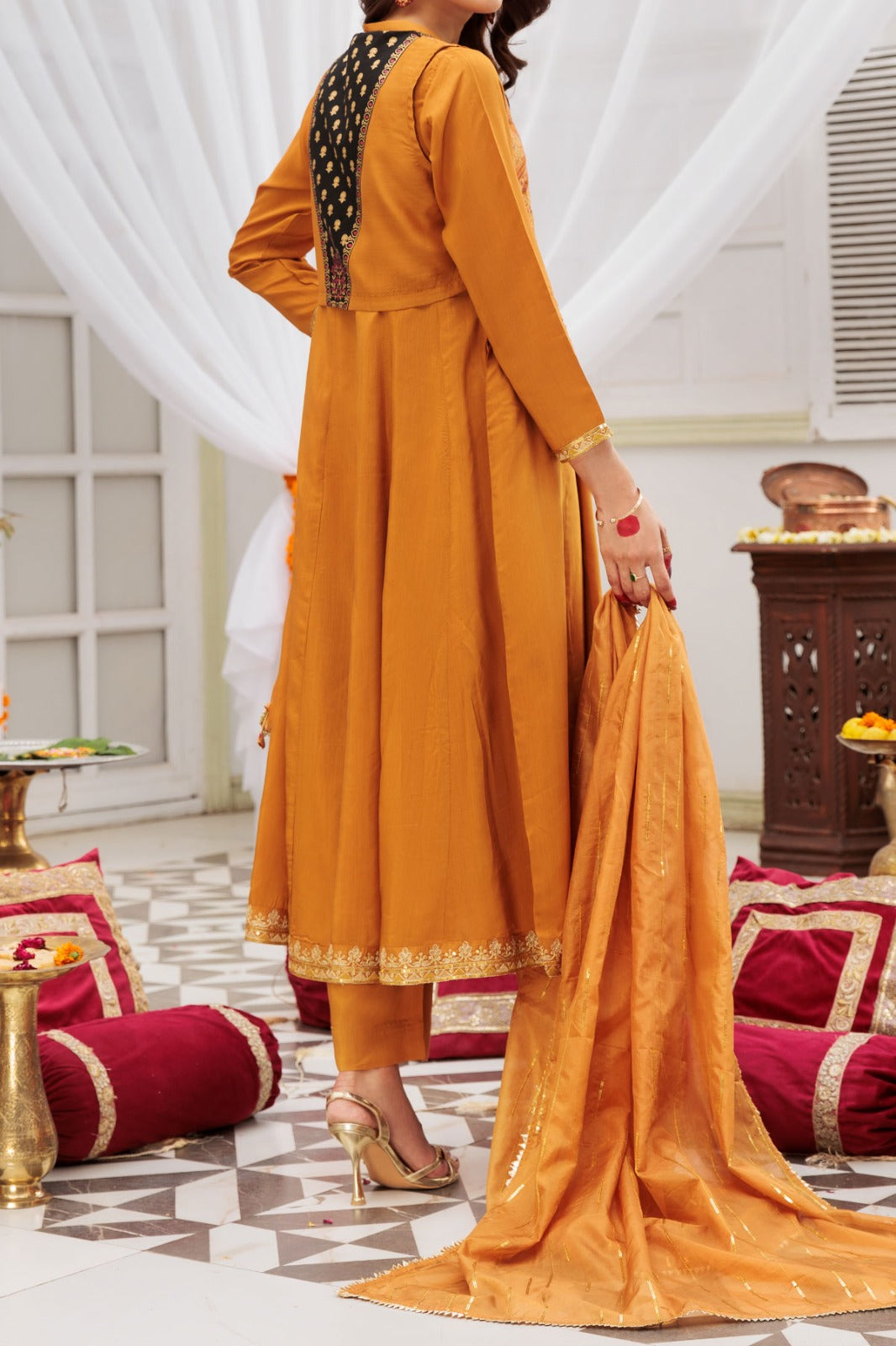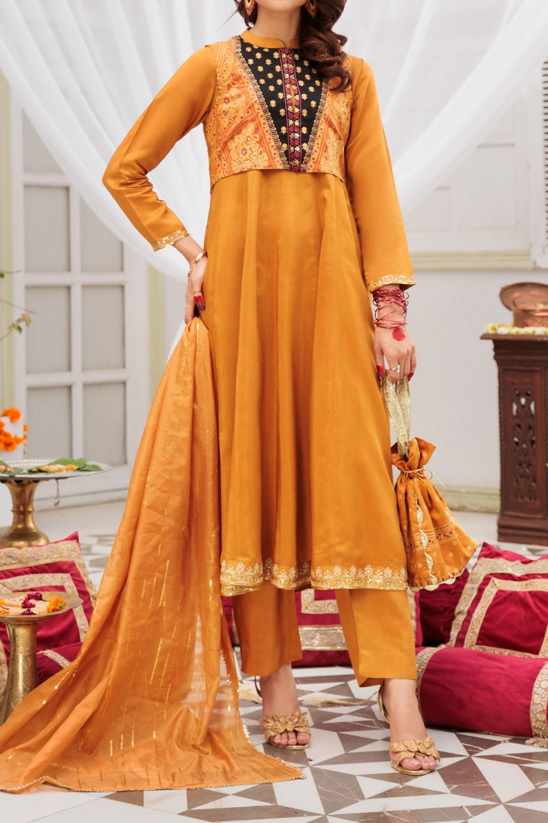 The Mustard embroidered frock with screen printing and tilla work is a stunning addition to any wardrobe. Crafted from high quality viscose, this elegant frock boasts intricate tilla work and beautiful screen printing. Paired with a delicate chiffon dupatta and straight trousers, this outfit is perfect for any occasion. Add a touch of style and sophistication to your wardrobe today.