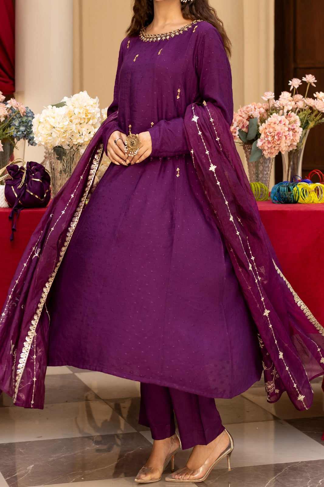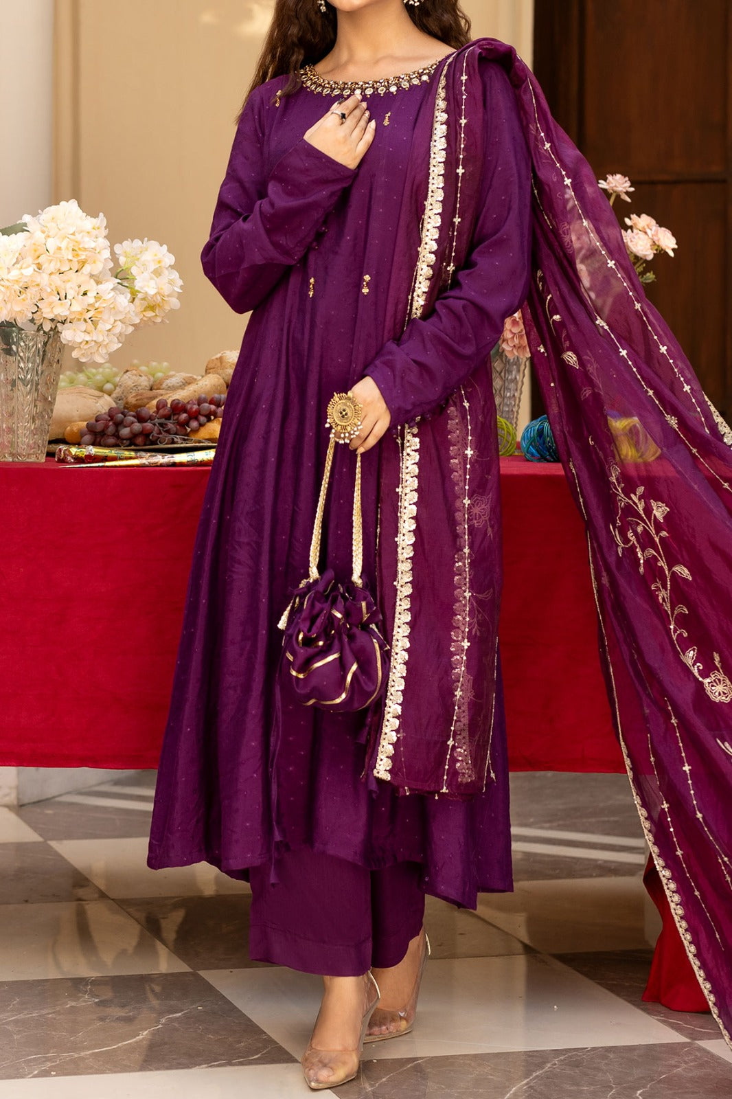 Plum embellished Jacquard A-line frock with viscose trouser and embroidered silk organza dupatta